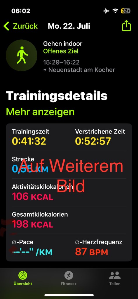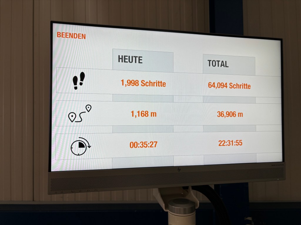 Neben der Geschwindigkeit ist die zweite Herausforderung die Belastung wieviel Gewicht mir abgenommen wird (möglich bis zu 100 Prozent Eigengewicht) und die orthesenführung, wieviel ich eben selbst laufe und wieviel ich geführt werde. Wenn die Einstellungen nicht optimal sind, knickt mein linker Fuß weg und wir müssen häufig korrigieren. Wenn alles passt, laufe ich über 30 Minuten am Stück.