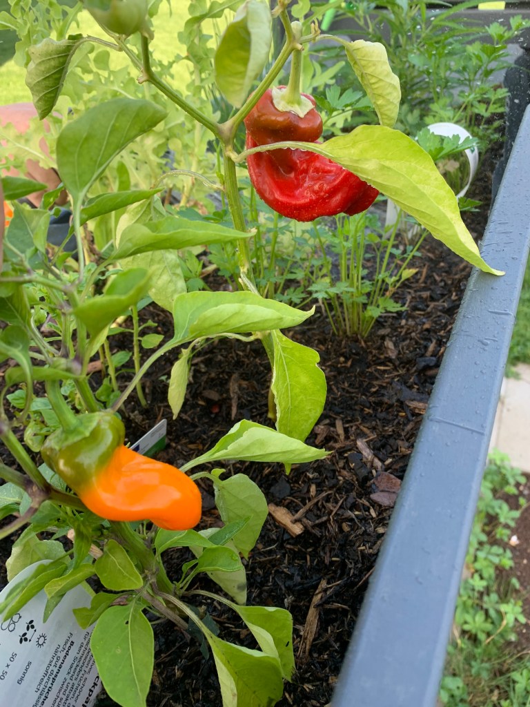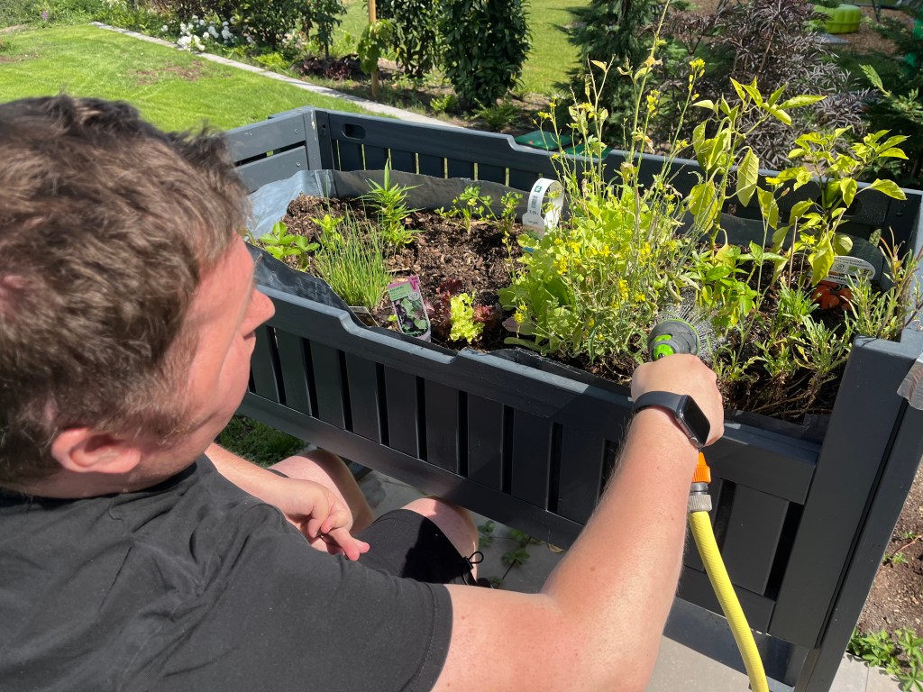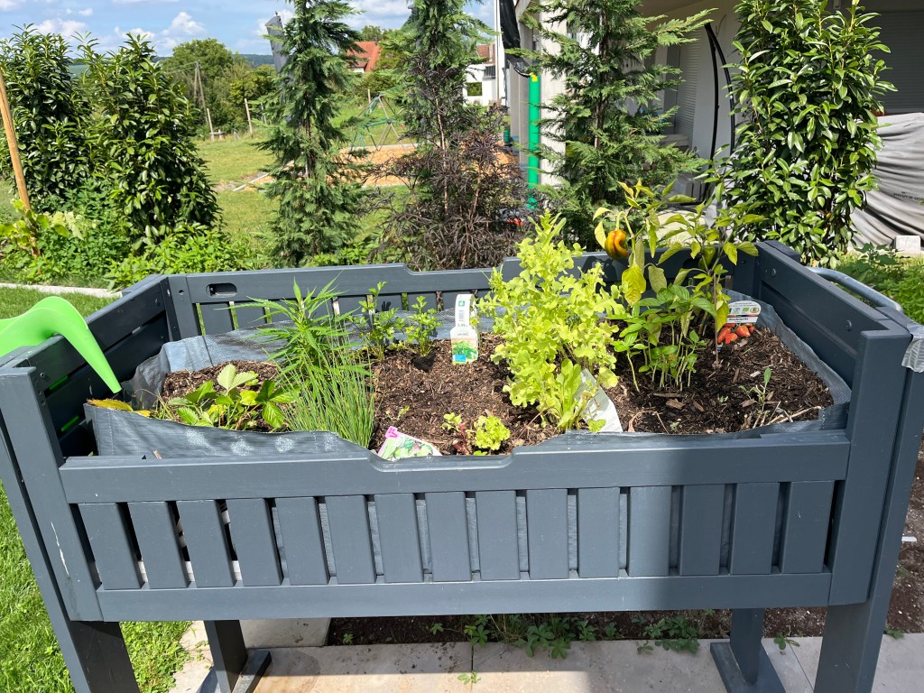 Dafür haben wir ein 4x1m großes Nutzbeet anlegen lassen und ich hab von meiner mutter ein unterfahrbares Hochbeet bekommen das sie selbst mit meinem Stiefvater gebaut hat und mit mir gemeinsam bepflanzt. u.a. Mit Schnittsalat, Wilderdbeeren, Schnittlauch, Petersilie, Basilikum und Paprika