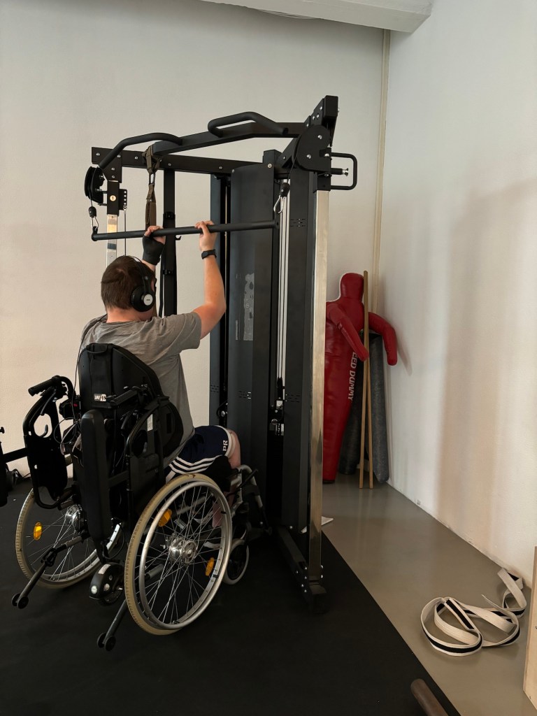Insgesamt fordert er mich kognitiv sehr heraus was super ist. Neben Oberkörper machen wir noch Beine und viel Arme – immer mit Fokus auf meine benachteiligte linke Seite, so z.B. an einem Seilzug mit Fokus auf den linken arm, die Schulter und die hand.
