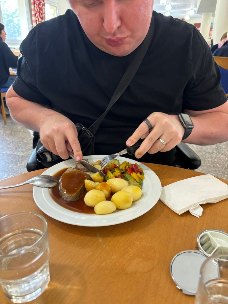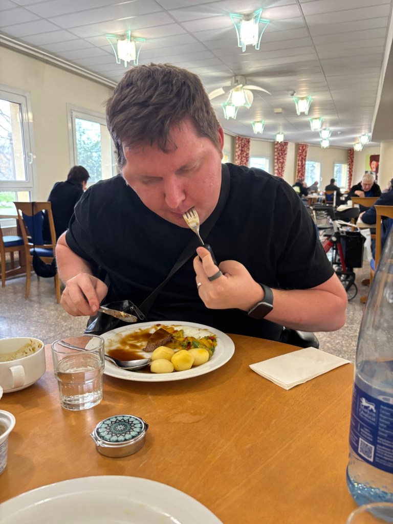 Heute am letzten Therapietag war ich nochmals am gehbarren und habe eine neue orthese probiert (S. Bild) ist super hatte ich aber erst später an – nicht im Video. Zusätzlich hatte ich eine verbreiterte Gabel zum testen (siehe Bild) hatte Mega funktioniert den Rinderbraten zu essen/schneiden. Hatten solches Besteck zu Hause schonmal probiert, aber die hier war besser. Bestellen wir für daheim.